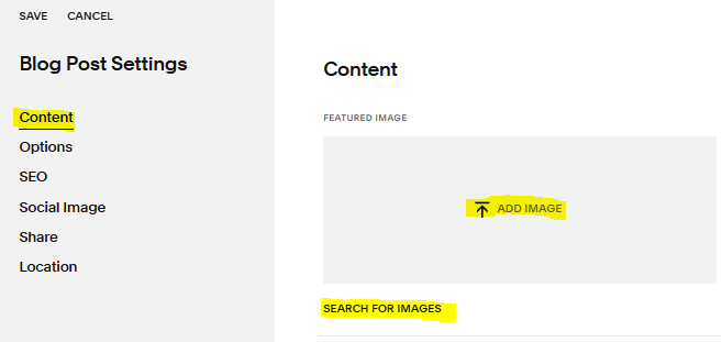 From the Blog Settings page, select Content > Thumbnail Image, then upload or drag and drop the thumbnail image into the box. Or SEARCH FOR IMAGES in the Asset library already uploaded.